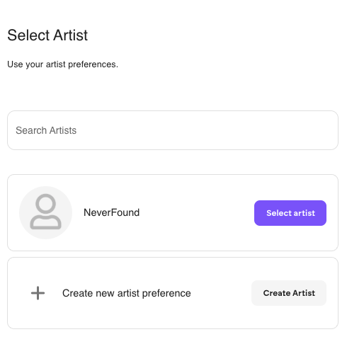 - If you have already set up your artist name in the Preferences of your account, you can click Select Artist next to the artist name. Otherwise, you can click Create Artist.