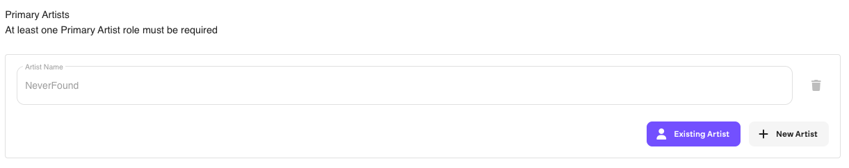 - To add another artist to the track, click Existing Artist (if you have uploaded this artist through this Too Lost account before) or New Participant.
