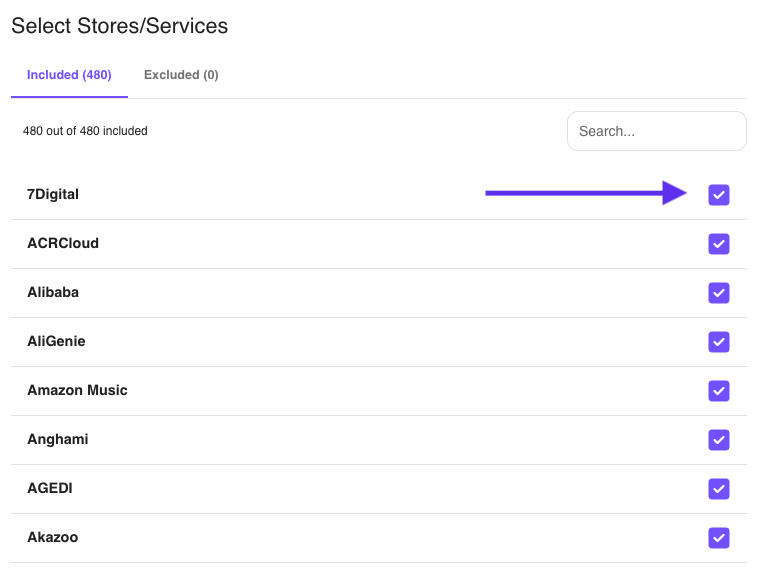 - If you would like to select the specific stores/services that you would like your release to be distributed to, click the Excluded button. Then, click the checkbox next to Include all. Finally, click the checkbox next to the stores/services you would like your release distributed to.